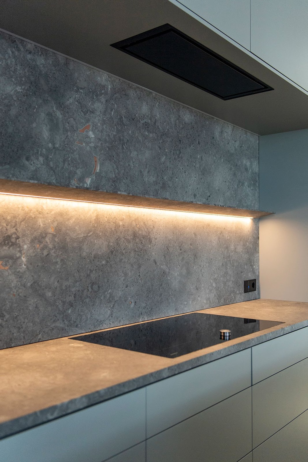 Derudover kan du med fordel tænke strømudtag og belysning ind som en del af løsningen. Det er også værd at overveje, om større elementer som køleskabet skal beklædes med natursten for at skabe et fuldt integreret udtryk.