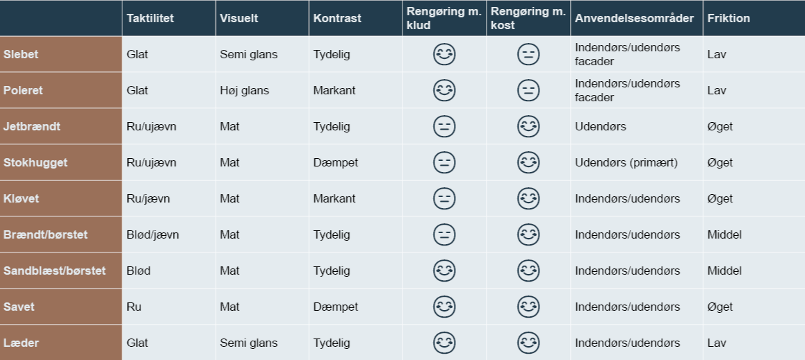 Her gennemgår vi de mest anvendte overflader på natursten – med fokus på fordele, ulemper og typiske anvendelser.