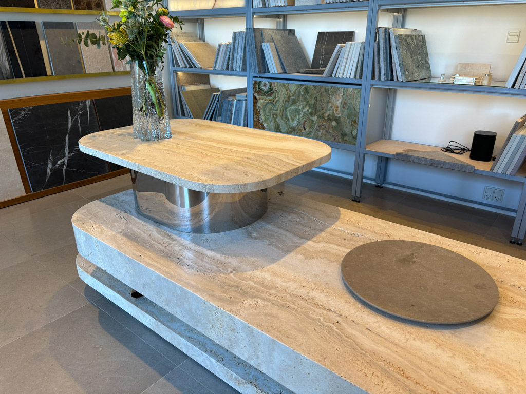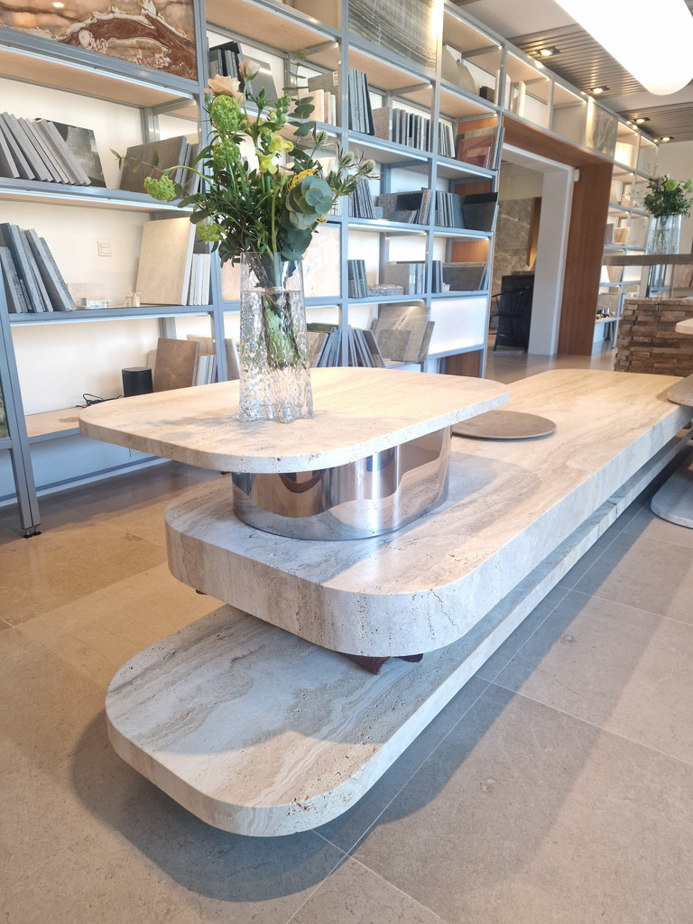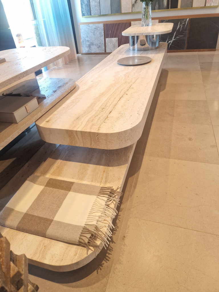 Møblet er udført i travertinen Navona i kombination med spejlstål og består af 7 sammensatte dele.